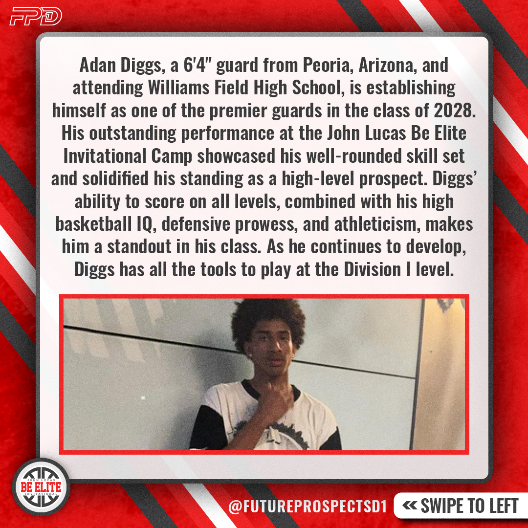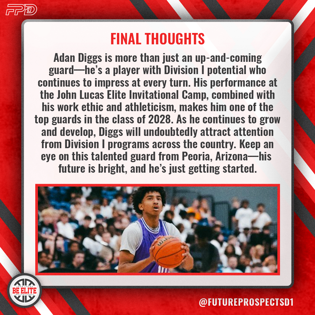 Adan Diggs is more than just an up-and-coming guard—he’s a player with Division I potential who continues to impress at every turn. His performance at the John Lucas Elite Invitational Camp, combined with his work ethic and athleticism, makes him one of the top guards in the class of 2028. As he continues to grow and develop, Diggs will undoubtedly attract attention from Division I programs across the country. Keep an eye on this talented guard from Peoria, Arizona—his future is bright, and he’s just getting started.