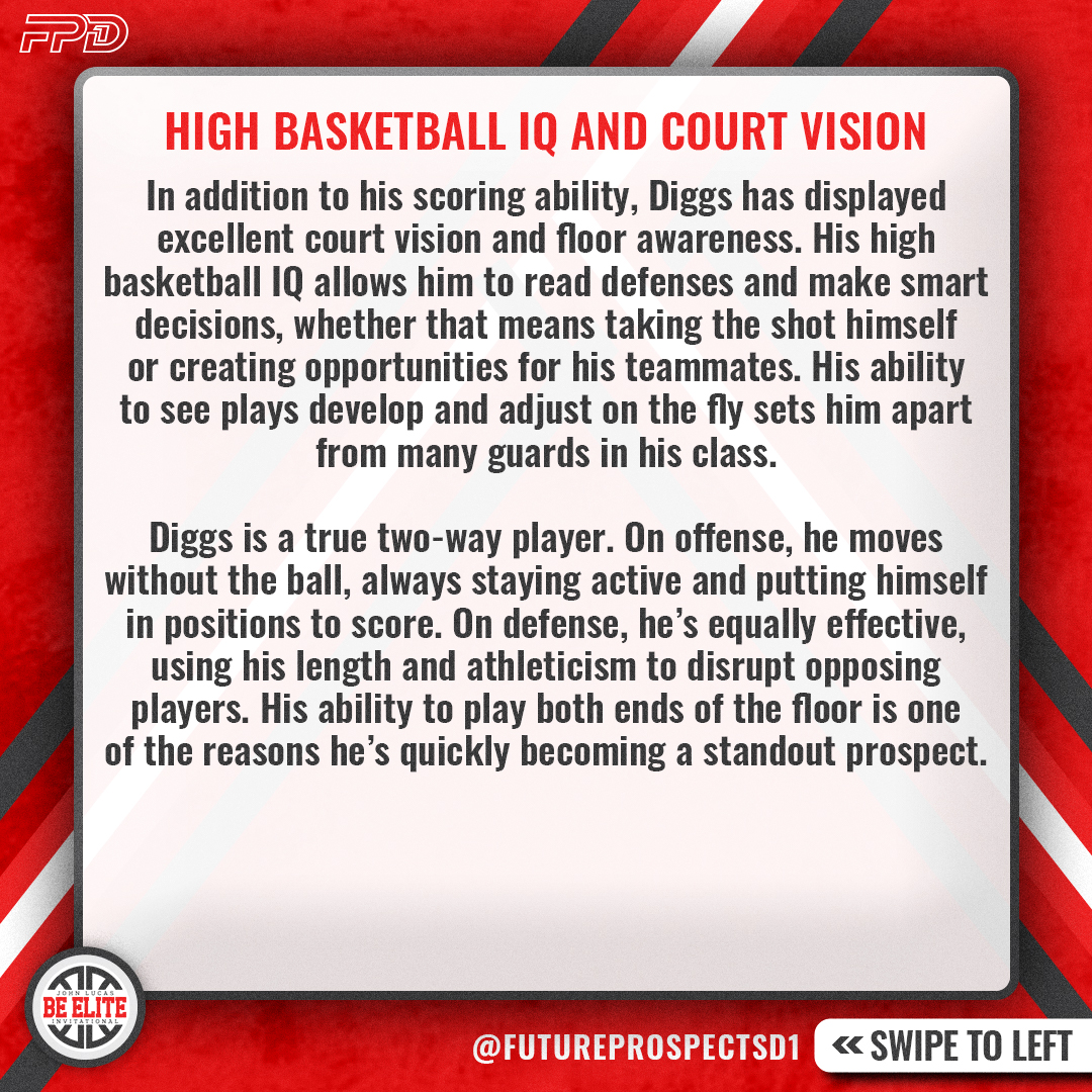 In addition to his scoring ability, Diggs has displayed excellent court vision and floor awareness. His high basketball IQ allows him to read defenses and make smart decisions, whether that means taking the shot himself or creating opportunities for his teammates. His ability to see plays develop and adjust on the fly sets him apart from many guards in his class.