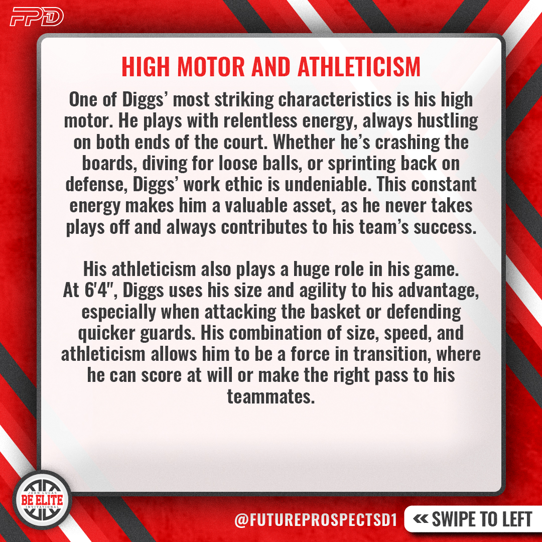 Diggs is a true two-way player. On offense, he moves without the ball, always staying active and putting himself in positions to score. On defense, he’s equally effective, using his length and athleticism to disrupt opposing players. His ability to play both ends of the floor is one of the reasons he’s quickly becoming a standout prospect.