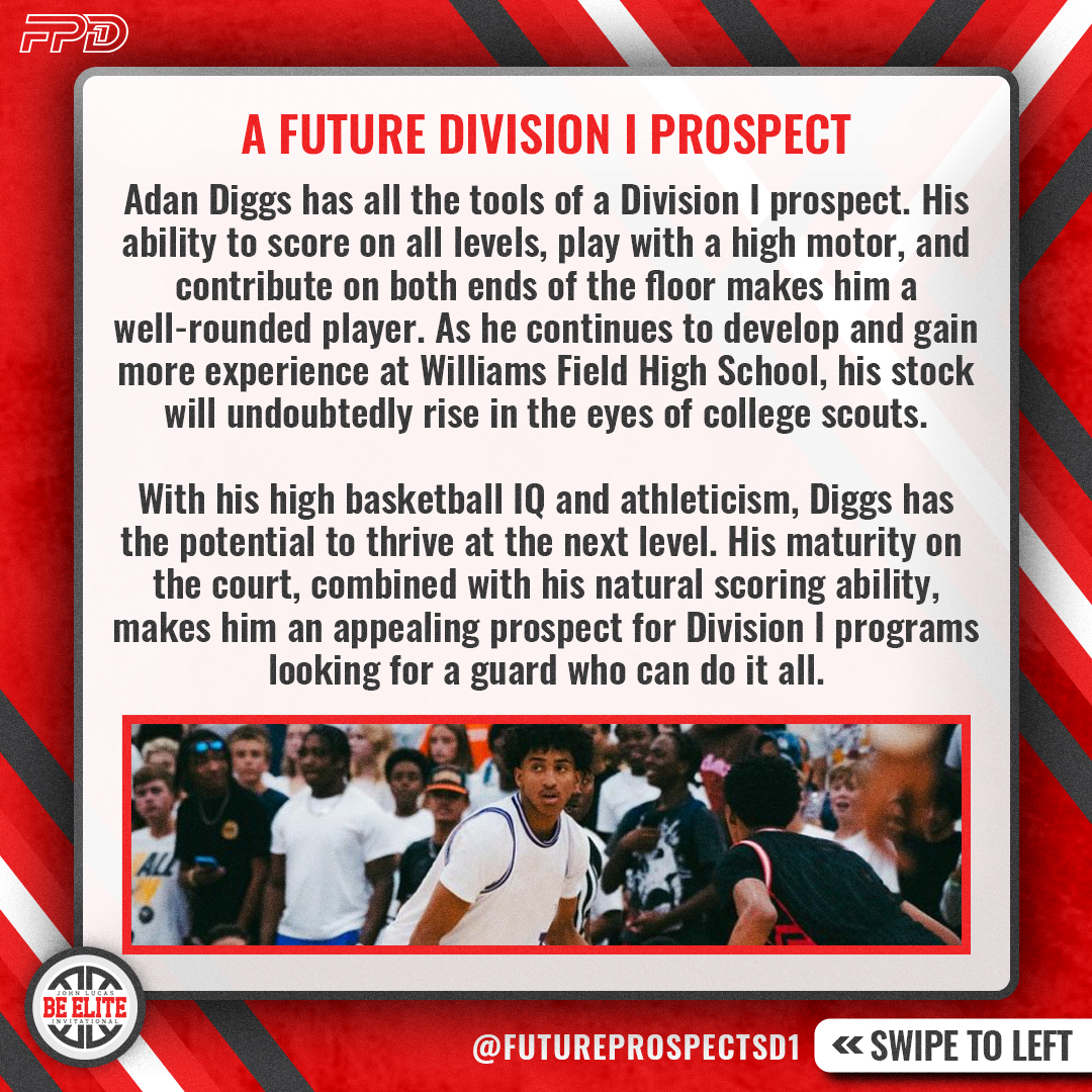 Adan Diggs has all the tools of a Division I prospect. His ability to score on all levels, play with a high motor, and contribute on both ends of the floor makes him a well-rounded player. As he continues to develop and gain more experience at Williams Field High School, his stock will undoubtedly rise in the eyes of college scouts.