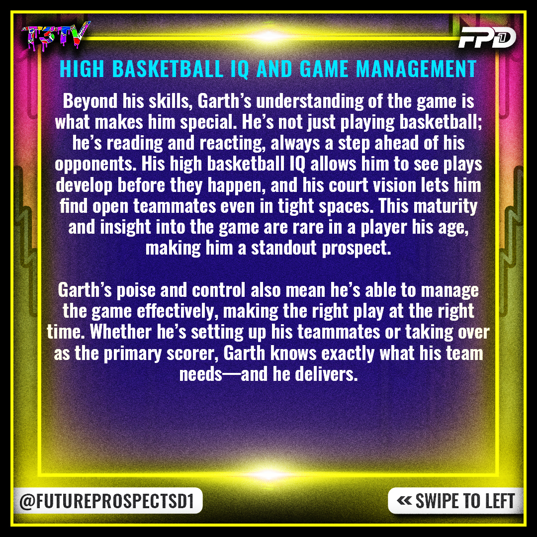 Beyond his skills, Garth’s understanding of the game is what makes him special. He’s not just playing basketball; he’s reading and reacting, always a step ahead of his opponents. His high basketball IQ allows him to see plays develop before they happen, and his court vision lets him find open teammates even in tight spaces. This maturity and insight into the game are rare in a player his age, making him a standout prospect.