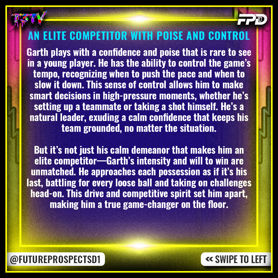 Garth plays with a confidence and poise that is rare to see in a young player. He has the ability to control the game’s tempo, recognizing when to push the pace and when to slow it down. This sense of control allows him to make smart decisions in high-pressure moments, whether he’s setting up a teammate or taking a shot himself. He’s a natural leader, exuding a calm confidence that keeps his team grounded, no matter the situation.