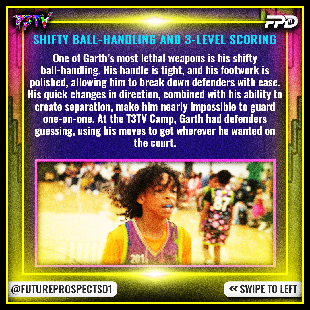 One of Garth’s most lethal weapons is his shifty ball-handling. His handle is tight, and his footwork is polished, allowing him to break down defenders with ease. His quick changes in direction, combined with his ability to create separation, make him nearly impossible to guard one-on-one. At the T3TV Camp, Garth had defenders guessing, using his moves to get wherever he wanted on the court.