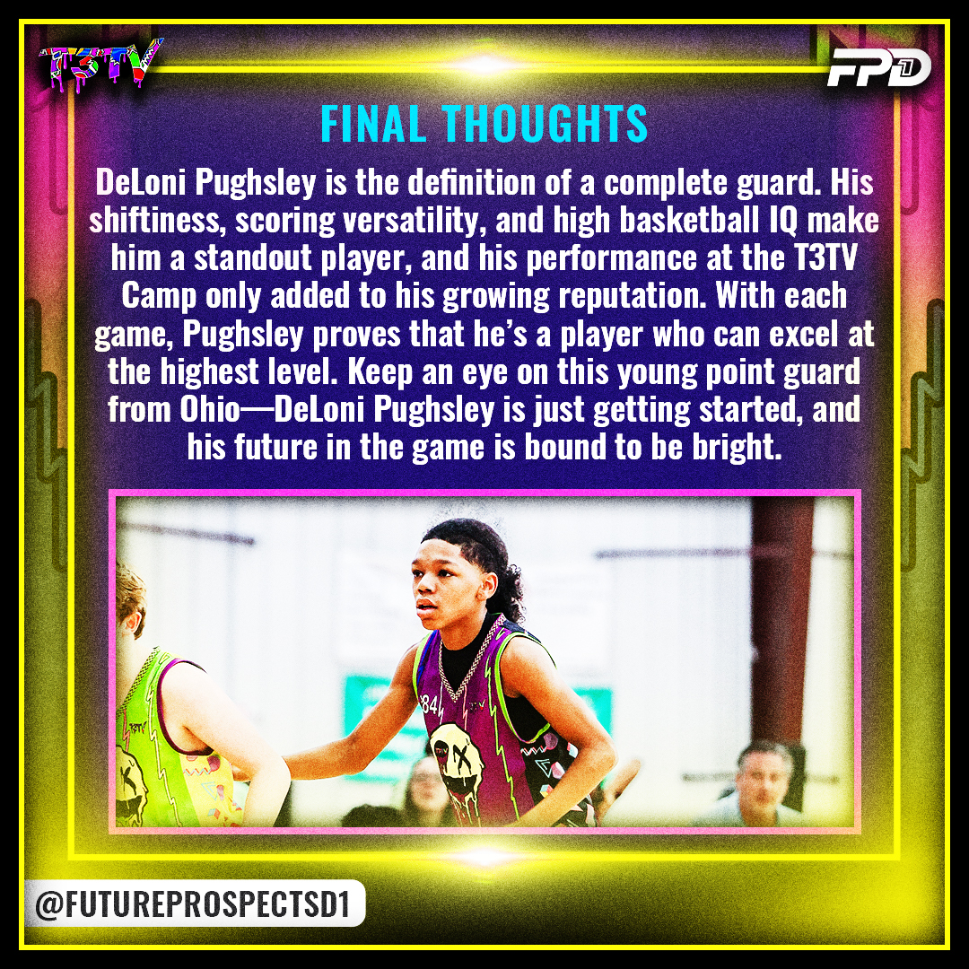 DeLoni Pughsley is the definition of a complete guard. His shiftiness, scoring versatility, and high basketball IQ make him a standout player, and his performance at the T3TV Camp only added to his growing reputation. With each game, Pughsley proves that he’s a player who can excel at the highest level. Keep an eye on this young point guard from Ohio—DeLoni Pughsley is just getting started, and his future in the game is bound to be bright.