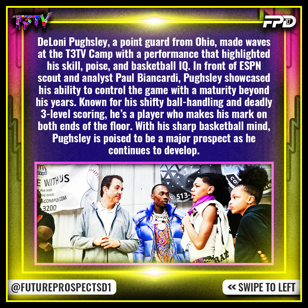 DeLoni Pughsley, a point guard from Ohio, made waves at the T3TV Camp with a performance that highlighted his skill, poise, and basketball IQ. In front of ESPN scout and analyst Paul Biancardi, Pughsley showcased his ability to control the game with a maturity beyond his years. Known for his shifty ball-handling and deadly 3-level scoring, he’s a player who makes his mark on both ends of the floor. With his sharp basketball mind, Pughsley is poised to be a major prospect as he continues to develop.