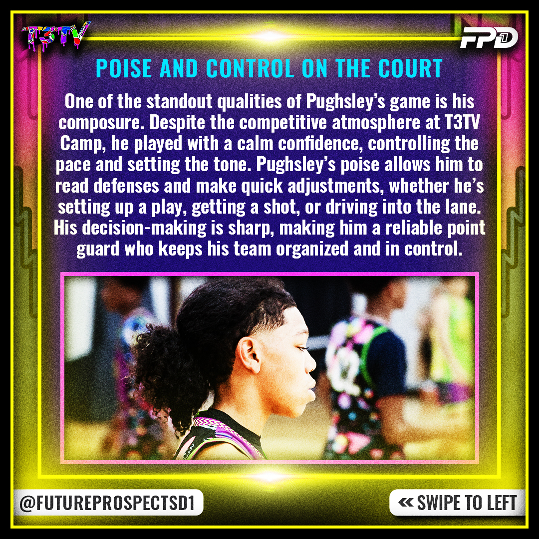 One of the standout qualities of Pughsley’s game is his composure. Despite the competitive atmosphere at T3TV Camp, he played with a calm confidence, controlling the pace and setting the tone. Pughsley’s poise allows him to read defenses and make quick adjustments, whether he’s setting up a play, getting a shot, or driving into the lane. His decision-making is sharp, making him a reliable point guard who keeps his team organized and in control.