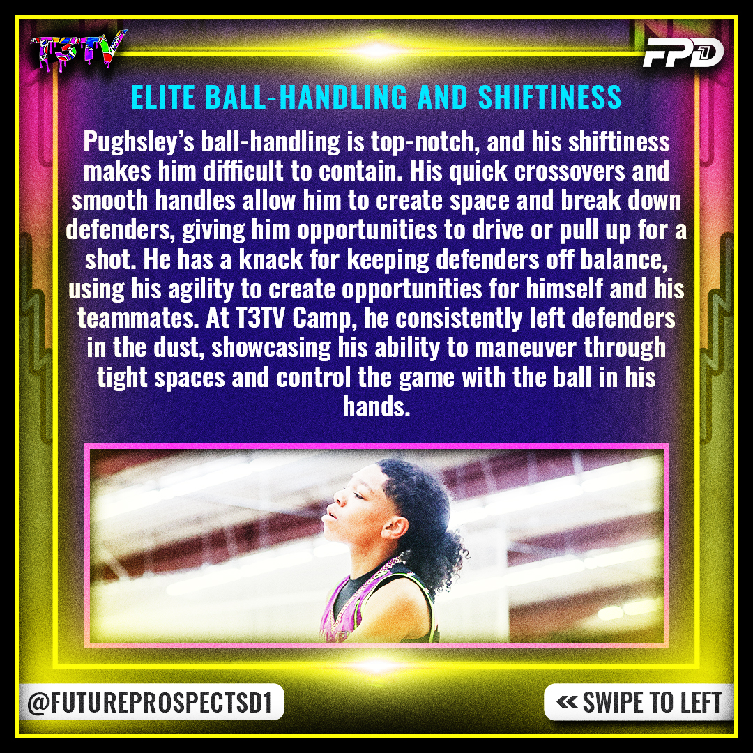 Pughsley’s ball-handling is top-notch, and his shiftiness makes him difficult to contain. His quick crossovers and smooth handles allow him to create space and break down defenders, giving him opportunities to drive or pull up for a shot. He has a knack for keeping defenders off balance, using his agility to create opportunities for himself and his teammates. At T3TV Camp, he consistently left defenders in the dust, showcasing his ability to maneuver through tight spaces and control the game with the ball in his hands.