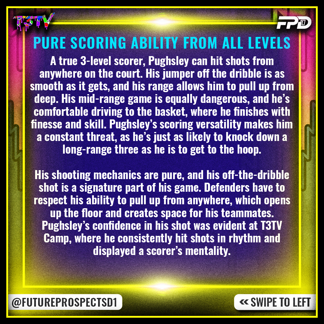 A true 3-level scorer, Pughsley can hit shots from anywhere on the court. His jumper off the dribble is as smooth as it gets, and his range allows him to pull up from deep. His mid-range game is equally dangerous, and he’s comfortable driving to the basket, where he finishes with finesse and skill. Pughsley’s scoring versatility makes him a constant threat, as he’s just as likely to knock down a long-range three as he is to get to the hoop.