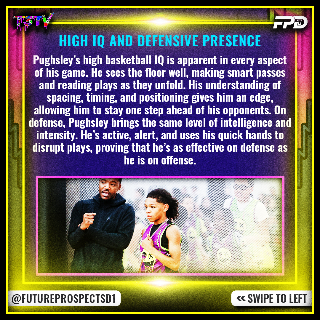 Pughsley’s high basketball IQ is apparent in every aspect of his game. He sees the floor well, making smart passes and reading plays as they unfold. His understanding of spacing, timing, and positioning gives him an edge, allowing him to stay one step ahead of his opponents. On defense, Pughsley brings the same level of intelligence and intensity. He’s active, alert, and uses his quick hands to disrupt plays, proving that he’s as effective on defense as he is on offense.
