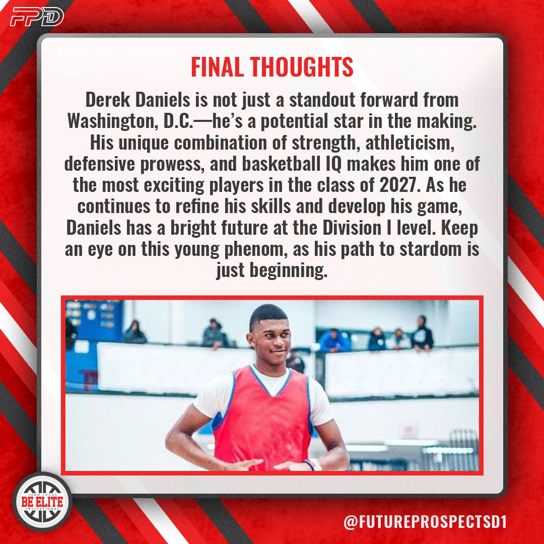 Derek Daniels is not just a standout forward from Washington, D.C.—he’s a potential star in the making. His unique combination of strength, athleticism, defensive prowess, and basketball IQ makes him one of the most exciting players in the class of 2027. As he continues to refine his skills and develop his game, Daniels has a bright future at the Division I level. Keep an eye on this young phenom, as his path to stardom is just beginning.