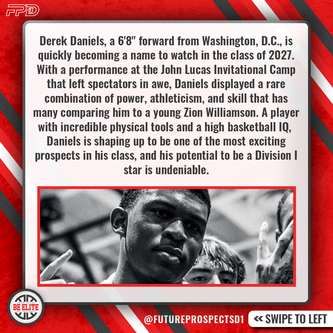 Derek Daniels, a 6’8″ forward from Washington, D.C., is quickly becoming a name to watch in the class of 2027. With a performance at the John Lucas Invitational Camp that left spectators in awe, Daniels displayed a rare combination of power, athleticism, and skill that has many comparing him to a young Zion Williamson. A player with incredible physical tools and a high basketball IQ, Daniels is shaping up to be one of the most exciting prospects in his class, and his potential to be a Division I star is undeniable.