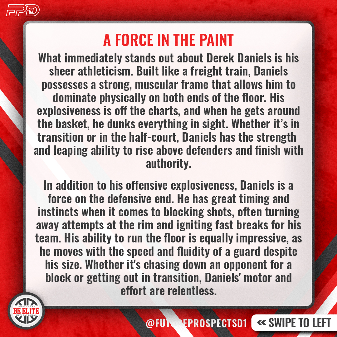 There’s no question that Derek Daniels has all the tools to be a high-level Division I prospect. His athleticism, combined with his defensive instincts and high basketball IQ, make him the complete package. As he continues to develop his offensive game, especially his shooting range and ball-handling, his potential will only increase.