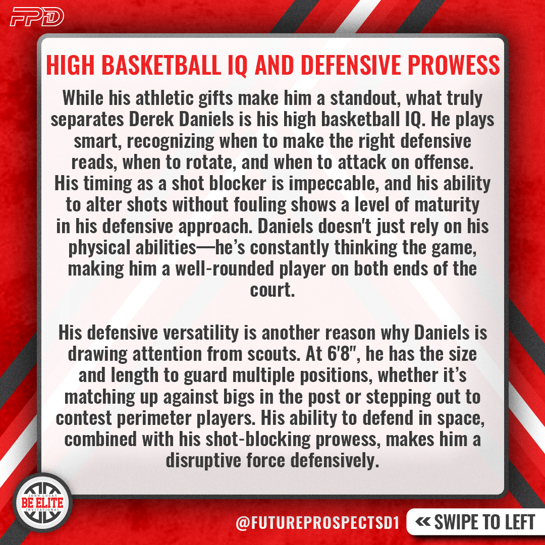 While his athletic gifts make him a standout, what truly separates Derek Daniels is his high basketball IQ. He plays smart, recognizing when to make the right defensive reads, when to rotate, and when to attack on offense. His timing as a shot blocker is impeccable, and his ability to alter shots without fouling shows a level of maturity in his defensive approach. Daniels doesn’t just rely on his physical abilities—he’s constantly thinking the game, making him a well-rounded player on both ends of the court.