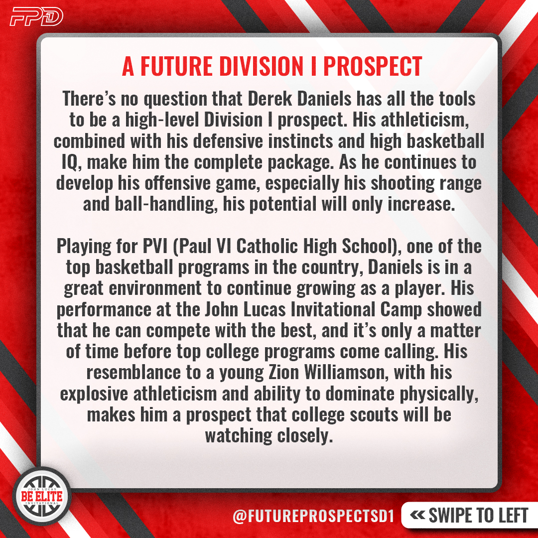 Playing for PVI (Paul VI Catholic High School), one of the top basketball programs in the country, Daniels is in a great environment to continue growing as a player. His performance at the John Lucas Invitational Camp showed that he can compete with the best, and it’s only a matter of time before top college programs come calling. His resemblance to a young Zion Williamson, with his explosive athleticism and ability to dominate physically, makes him a prospect that college scouts will be watching closely.