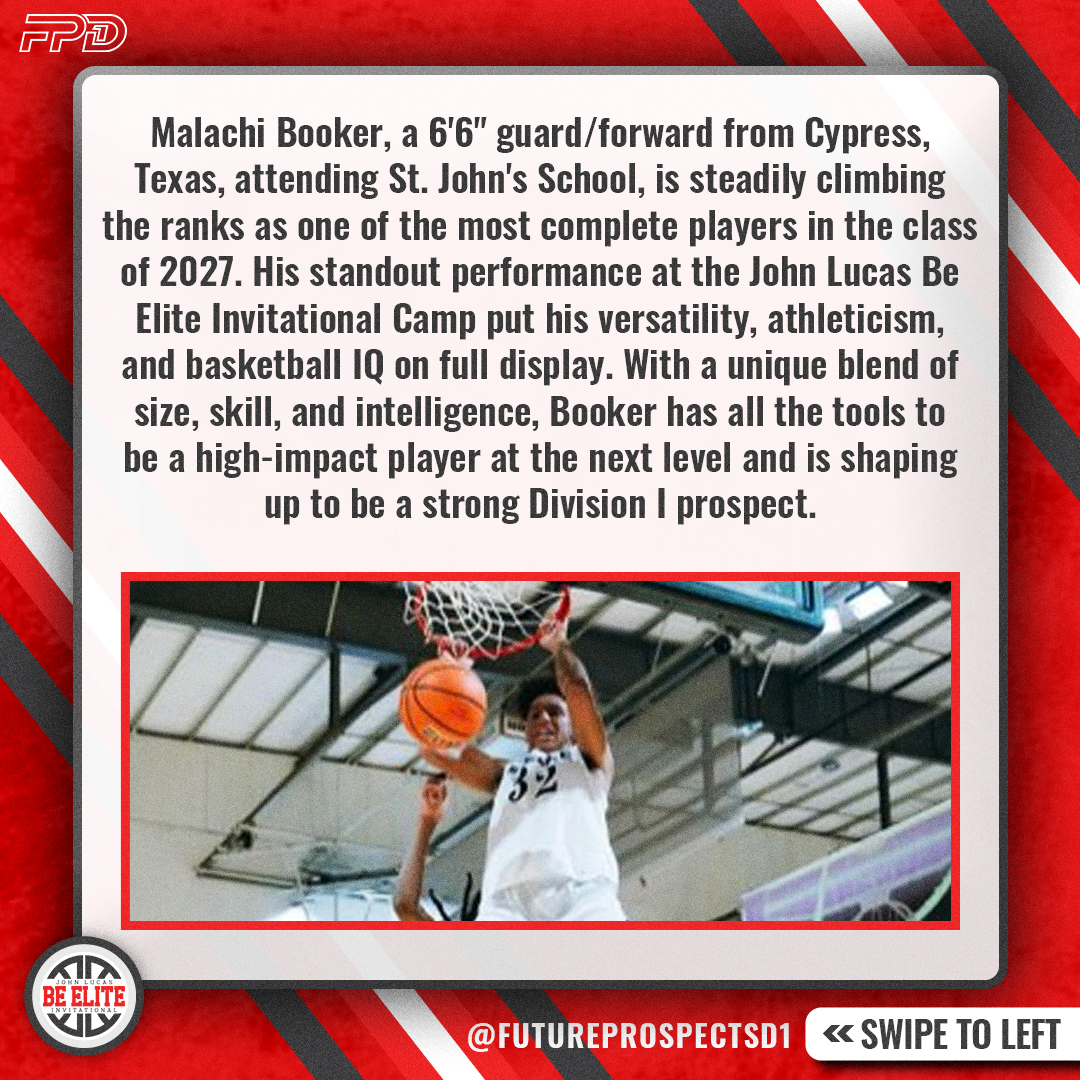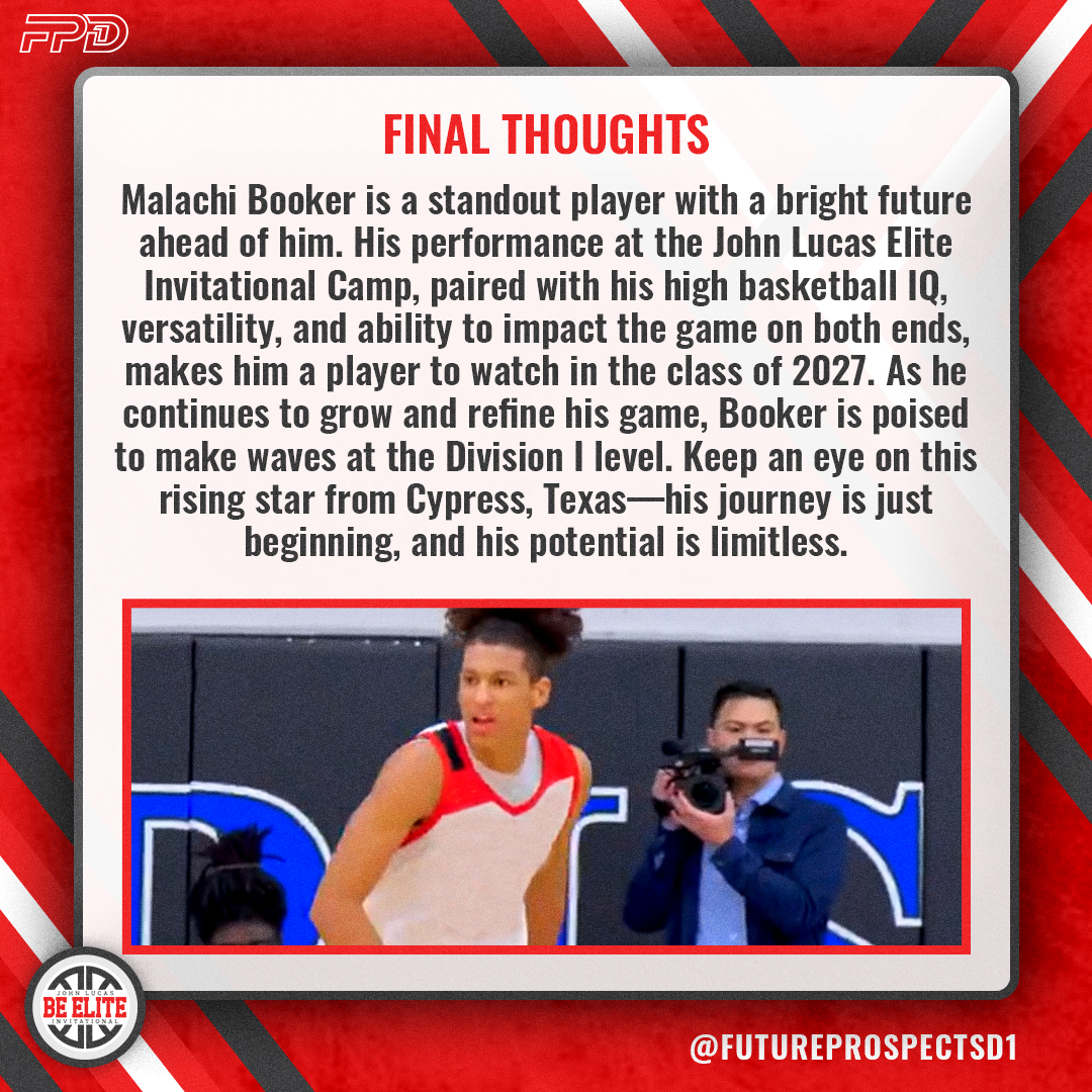 Malachi Booker is a standout player with a bright future ahead of him. His performance at the John Lucas Elite Invitational Camp, paired with his high basketball IQ, versatility, and ability to impact the game on both ends, makes him a player to watch in the class of 2027. As he continues to grow and refine his game, Booker is poised to make waves at the Division I level. Keep an eye on this rising star from Cypress, Texas—his journey is just beginning, and his potential is limitless.