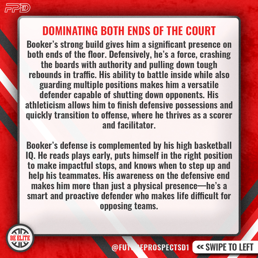 Booker’s strong build gives him a significant presence on both ends of the floor. Defensively, he’s a force, crashing the boards with authority and pulling down tough rebounds in traffic. His ability to battle inside while also guarding multiple positions makes him a versatile defender capable of shutting down opponents. His athleticism allows him to finish defensive possessions and quickly transition to offense, where he thrives as a scorer and facilitator.