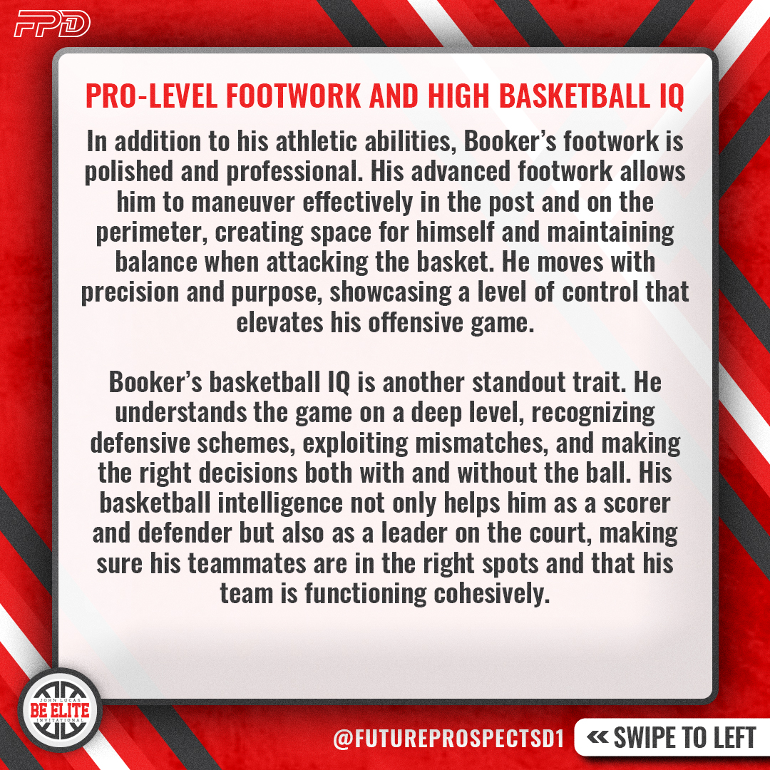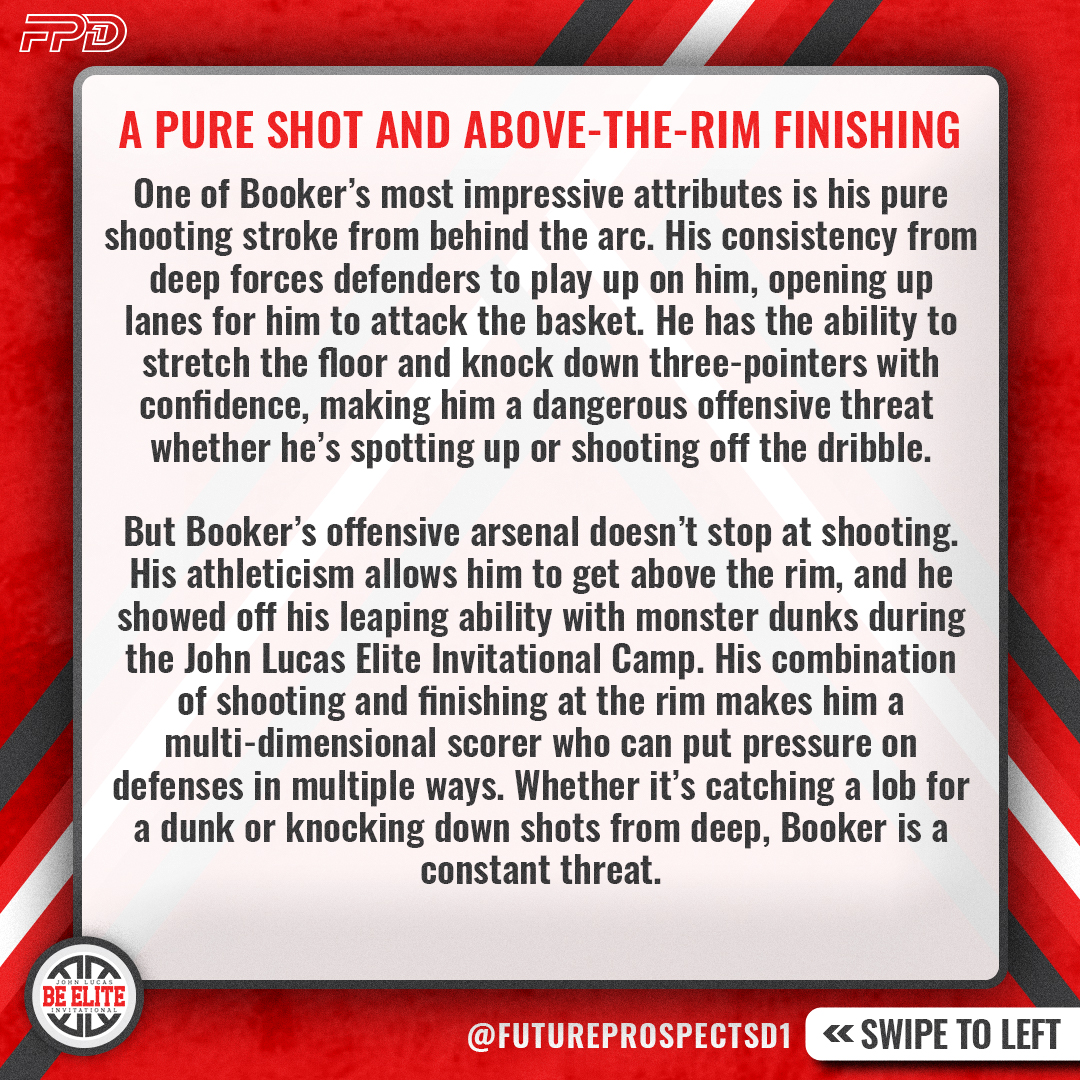 But Booker’s offensive arsenal doesn’t stop at shooting. His athleticism allows him to get above the rim, and he showed off his leaping ability with monster dunks during the John Lucas Elite Invitational Camp. His combination of shooting and finishing at the rim makes him a multi-dimensional scorer who can put pressure on defenses in multiple ways. Whether it’s catching a lob for a dunk or knocking down shots from deep, Booker is a constant threat.