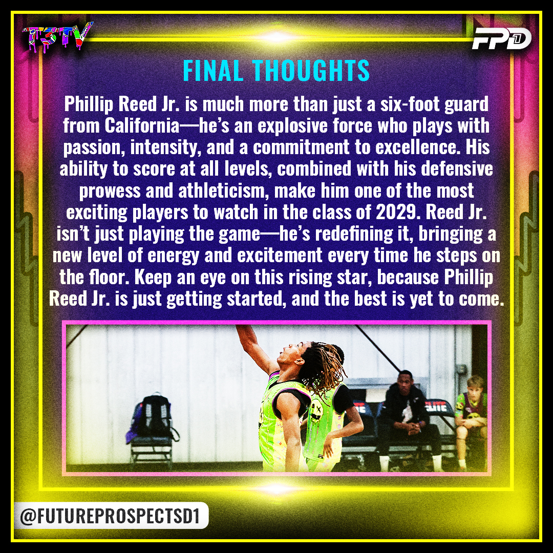Phillip Reed Jr. is much more than just a six-foot guard from California—he’s an explosive force who plays with passion, intensity, and a commitment to excellence. His ability to score at all levels, combined with his defensive prowess and athleticism, make him one of the most exciting players to watch in the class of 2029. Reed Jr. isn’t just playing the game—he’s redefining it, bringing a new level of energy and excitement every time he steps on the floor. Keep an eye on this rising star, because Phillip Reed Jr. is just getting started, and the best is yet to come.