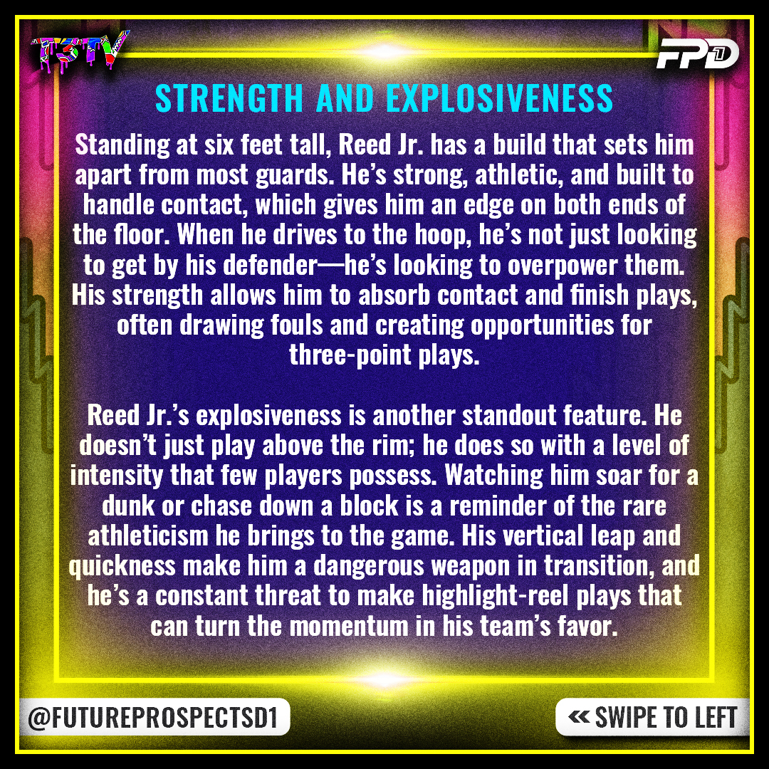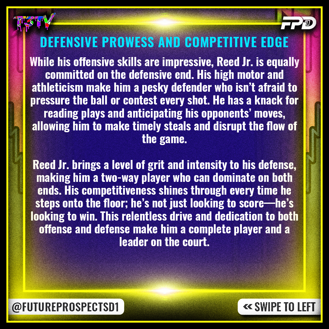 Reed Jr. brings a level of grit and intensity to his defense, making him a two-way player who can dominate on both ends. His competitiveness shines through every time he steps onto the floor; he’s not just looking to score—he’s looking to win. This relentless drive and dedication to both offense and defense make him a complete player and a leader on the court.