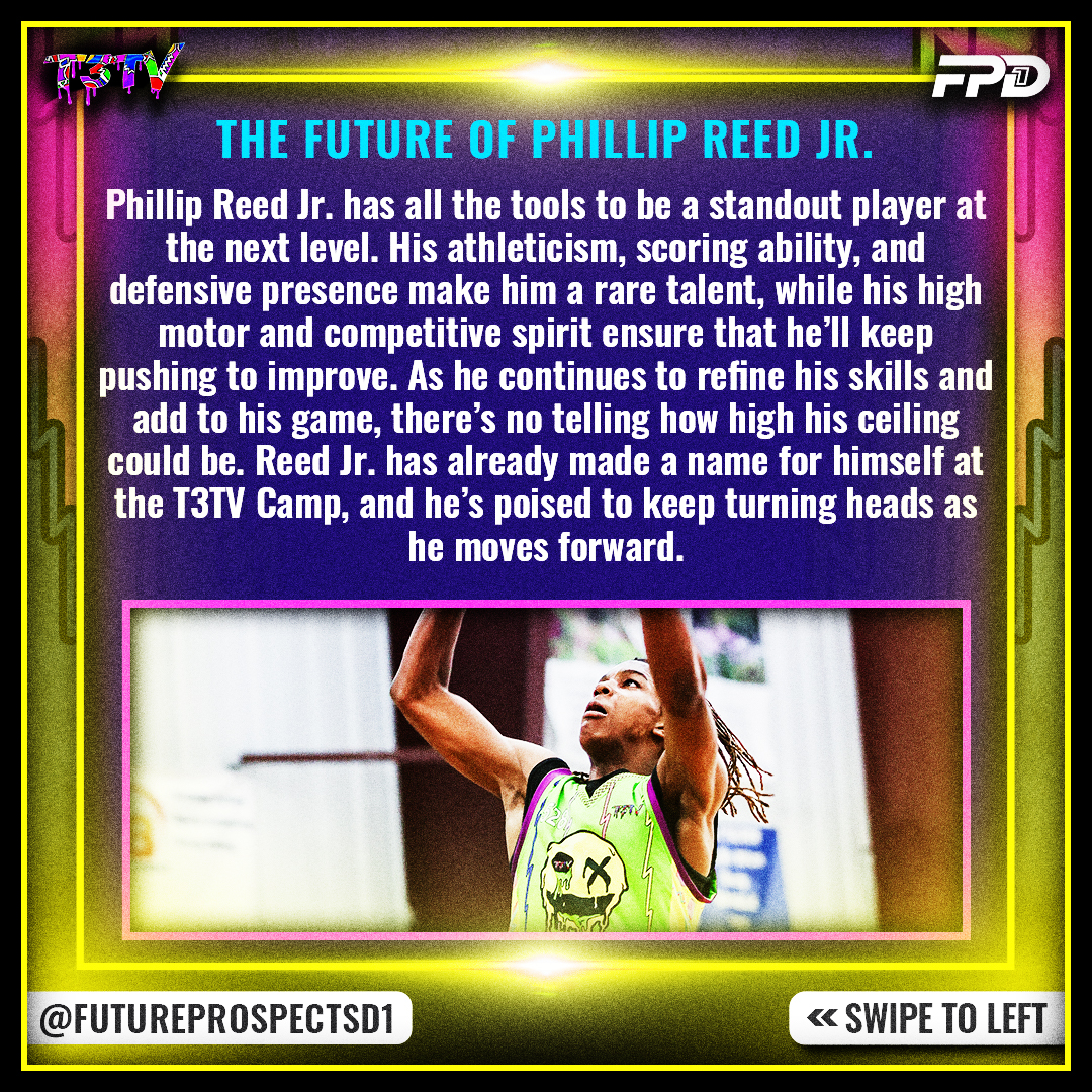 Phillip Reed Jr. has all the tools to be a standout player at the next level. His athleticism, scoring ability, and defensive presence make him a rare talent, while his high motor and competitive spirit ensure that he’ll keep pushing to improve. As he continues to refine his skills and add to his game, there’s no telling how high his ceiling could be. Reed Jr. has already made a name for himself at the T3TV Camp, and he’s poised to keep turning heads as he moves forward.