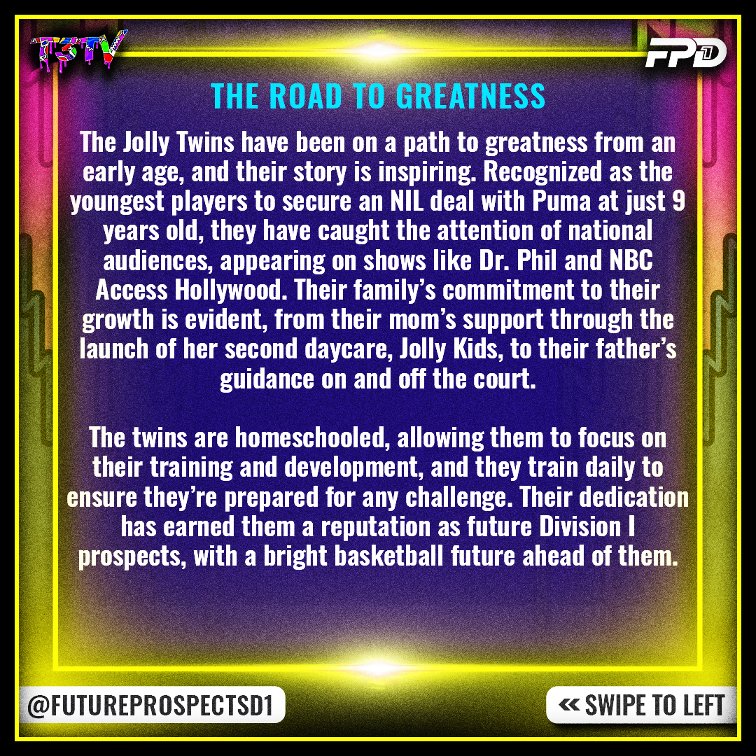 The Jolly Twins have been on a path to greatness from an early age, and their story is inspiring. Recognized as the youngest players to secure an NIL deal with Puma at just 9 years old, they have caught the attention of national audiences, appearing on shows like Dr. Phil and NBC Access Hollywood. Their family’s commitment to their growth is evident, from their mom’s support through the launch of her second daycare, Jolly Kids, to their father’s guidance on and off the court.
