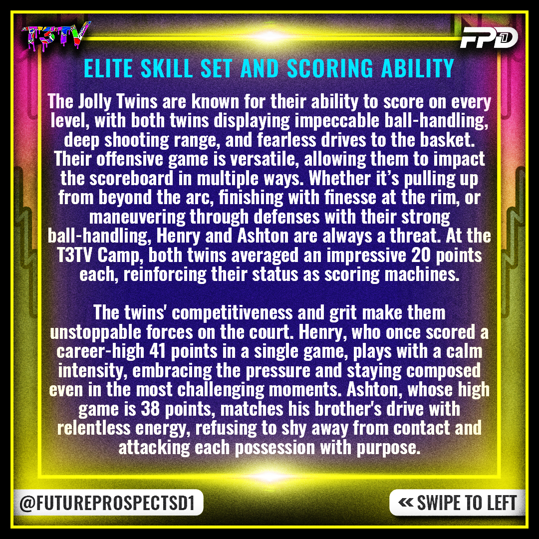 The Jolly Twins are known for their ability to score on every level, with both twins displaying impeccable ball-handling, deep shooting range, and fearless drives to the basket. Their offensive game is versatile, allowing them to impact the scoreboard in multiple ways. Whether it’s pulling up from beyond the arc, finishing with finesse at the rim, or maneuvering through defenses with their strong ball-handling, Henry and Ashton are always a threat. At the T3TV Camp, both twins averaged an impressive 20 points each, reinforcing their status as scoring machines.