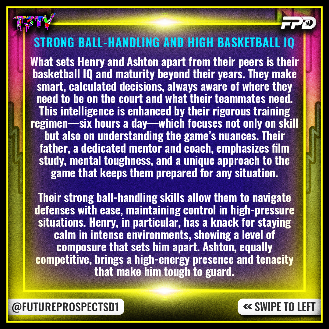What sets Henry and Ashton apart from their peers is their basketball IQ and maturity beyond their years. They make smart, calculated decisions, always aware of where they need to be on the court and what their teammates need. This intelligence is enhanced by their rigorous training regimen—six hours a day—which focuses not only on skill but also on understanding the game’s nuances. Their father, a dedicated mentor and coach, emphasizes film study, mental toughness, and a unique approach to the game that keeps them prepared for any situation.